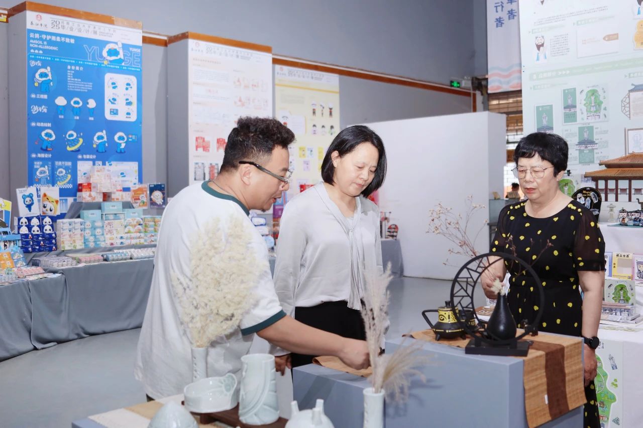 在作品展位前,她指出,艺术学院需立足漯河深厚的文化底蕴,以文创作品为载体,推动地方文化创造性转化与创新性发展。针对下一步工作的开展,她提出三点要求:一要深挖文化内涵,打造地域特色品牌。聚焦贾湖文化、许慎文化,结合商埠历史与食品产业优势,通过文创设计讲好漯河故事,形成兼具文化厚度与市场竞争力的文创产品体系。二要深化校企协同,构建融合发展生态。以服务地方发展为导向,加强与地方企业在包装品牌升级等领域的合作,助力企业品牌价值提升。三要强化人才培养,拓展思政发展格局。将地方文化传承与思政教学深度融合,引导学生理解创新与工匠精神的实际内涵。